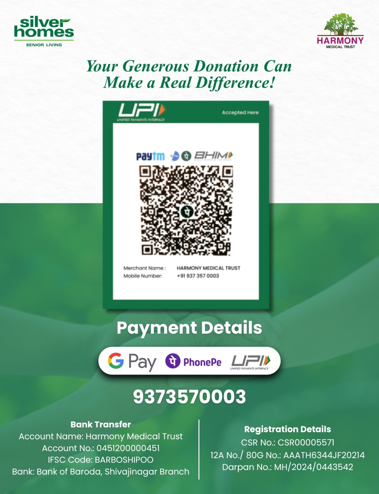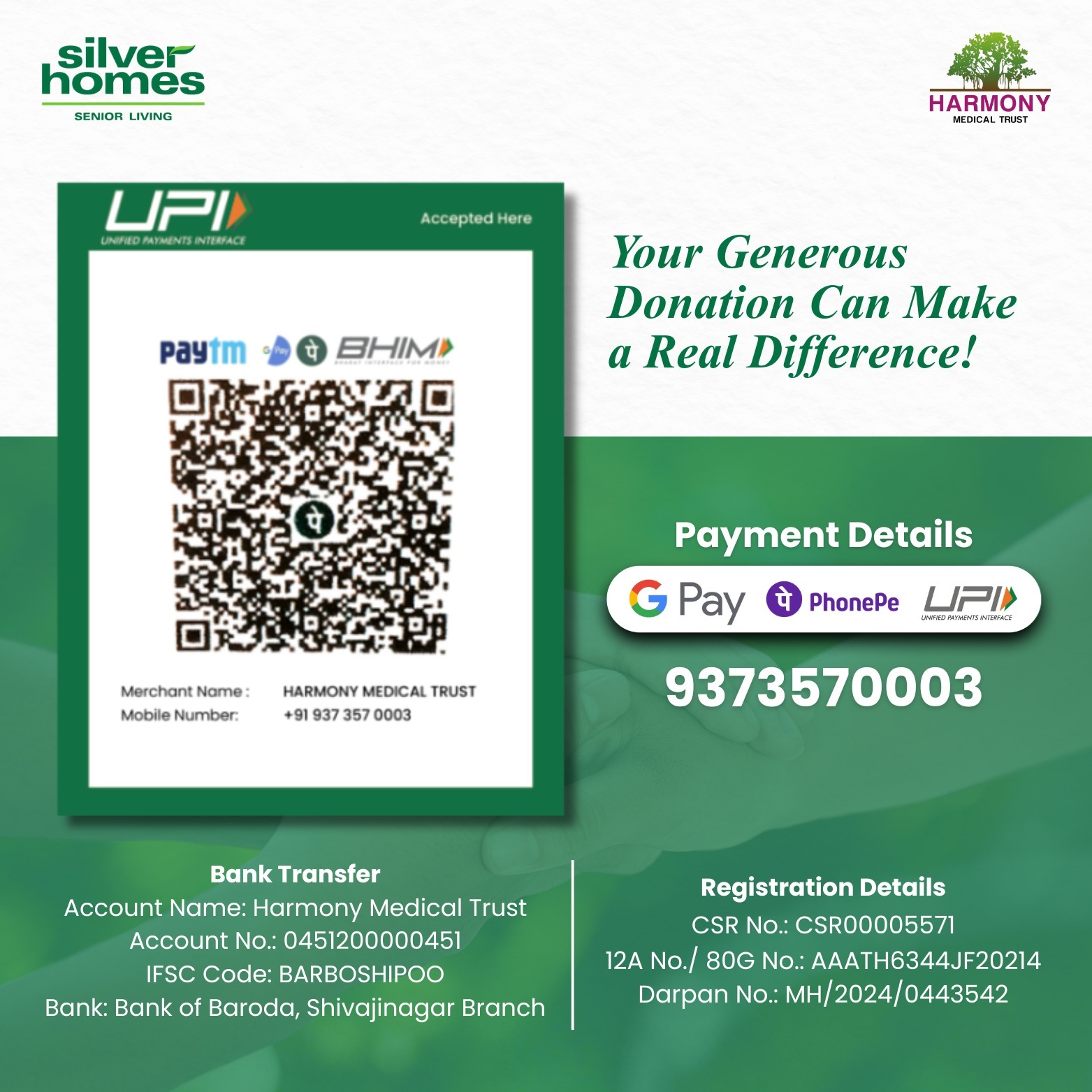 Harmony Medical Trust has taken up the cause of senior Citizen and is currently supporting Silver Homes, Old-age home cum assisted living Facility. We would use your donation for supplying meals to underprivileged elderly, stay facility for the needy & most important , work with elderly holistic living & health.